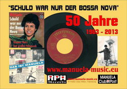 Vor einem halben Jahrhundert wurde der erste und einzige Nummer-Eins-Hit “Schuld war nur der Bossa Nova” mit Manuela im Frühjahr 1963 veröffentlicht und auch nach 50 Jahren zählt dieses Lied zu den Deutschen Kult-Schlagern des 20. Jahrhunderts. Die deutsche Version des US-Hits “Blame It On The Bossa Nova” gesungen von Eydie Gormé wurde im Original-Text und Musik von Cynthia Weil und Barry Mann geschrieben. Der deutsche Text stammt von Georg Buschor. Mit dem Hit “Schuld war nur der Bossa Nova” wurde Manuela über Nacht zum Star und verdrängte sich selber in den Hitparden von Platz 1 (“Wini Wini” gesungen von den Tahitii Tamourés, hier war Manuela eine der drei Liedsängerinnen) der BRAVO Musicbox. Die Platte war 24 Wochen in den Top 50, davon 20 Wochen unter den ersten 10. Manuela sang das Lied mit einem Akzent, dem rollenden “Rrr”, welches zu ihrem Markenzeichen wurde.