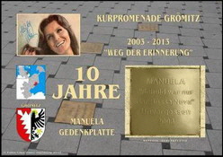 Wohl jeder kennt den “Walk Of Fame” im kalifornischen Hoolywood / USA, wo Künstlern und Prominenten mit Sternen- Tafeln ein Denkmal gesetzt wird. Auch Manuela war in den USA eine Zeitlang ansässig. Aber auch in Grömitz bietet auf der Kurpromenade einen solchen “Walk Of Fam” ober besser gesagt, den “Weg der Erinnerung” an. 2003 wurde dieser Weg der Erinnerung durch die Initiative von Ursula Gradert (†), Haupt-Club- Leiterin (Schleswig-Holstein), um eine eine weitere besondere Attraktion bereichert - einer Gedenkplatte zu Ehren von Manuela in Deutschland.