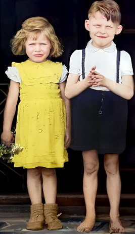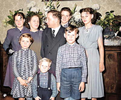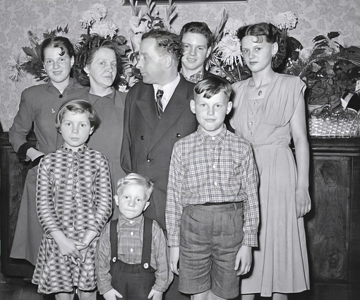 Doris (unten links) als Achtjährige mit den fünf Geschwistern, Helga, Ruth, Karl-Heinz, Peter und Klaus, bei einer Familienfeier mit den Eltern Frieda und Erich Dittmer