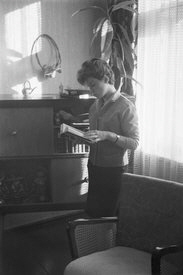 Doris hier beim Lesen in einem Buch zu Hause bei Muttern im Wohn-