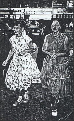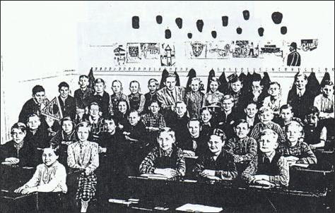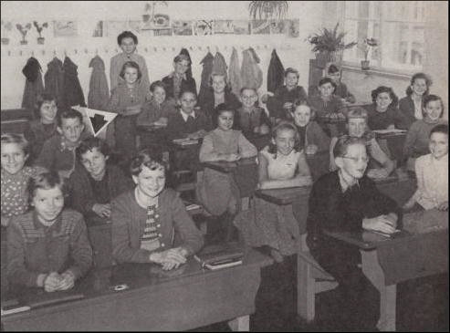 links: siehe Dreieck im linken Bildteil Doris mit ihrem Klassenlehrer und der gesamten Schulklasse