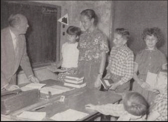 rechts: Doris (Pfeil) mit Lehrer und Mitschüler/in am Lehrerpult 5. Kasse