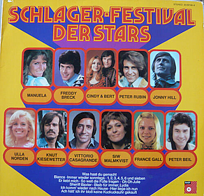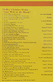 LP - Sampler: Zu Ehren von Christian Bruhn das Medley “Meine Welt ist die Musik” zu hören und Manuela ist hier viermal mit dabei und zwar bei Lied 1 + 19 mit allen Mitwirkenden, bei Lied 4 als Solistin mit “Monsieur Dupont” und bei Lied 14 im Duett mit Dorthe und sie singen den Jacqueline Boyer Hit aus dem Jahr 1963 “Mitsou” - eine sehr seltene Rarität.